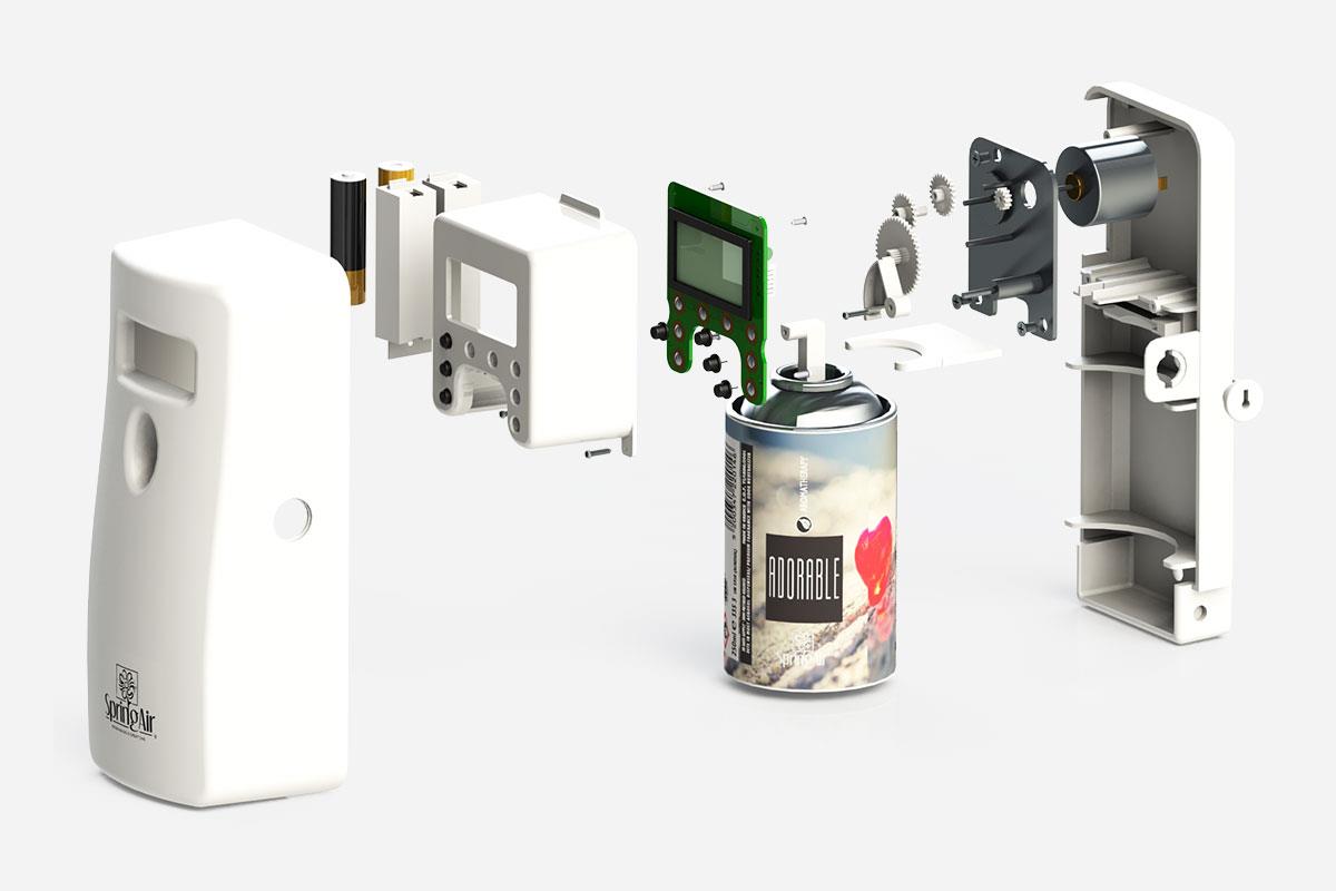 Η Solid Engineering, ανέλαβε να αναπτύξει συσκευή με αυτές τις προδιαγραφές για τη Spring Air. Μια σειρά από εντυπωσιακά concept designs παρουσιάστηκαν στα αρμόδια τμήματα της εταιρίας, και μετά την αξιολόγηση τους και την επιλογή του τελικού σχεδίου ξεκίνησε η μοντελοποίηση 3D λαμβάνοντας υπόψη και τα υπόλοιπα εξαρτήματα που θα έπρεπε να σχεδιαστούν από την αρχή όπως το PCB ή να αγοραστούν από το εμπόριο, όπως οι μπαταρίες. Ο σχεδιασμός της πλακέτας PCB ξεκίνησε ταυτόχρονα με στόχο την επίτευξη του ελάχιστου μεγέθους της συσκευής, λαμβάνοντας υπόψη παραμέτρους όπως, η διάρκεια ζωής της μπαταρίας, η πίεση που απαιτείται από το spray ψεκασμού, η ευκολία στη συναρμολόγηση / αποσυναρμολόγηση και η συντήρησή της.